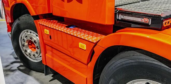 車輛四根后軸的擋泥板之間也安裝了小尺寸的儲(chǔ)物箱,覆以花紋鋼板并安裝了側(cè)面提示燈。