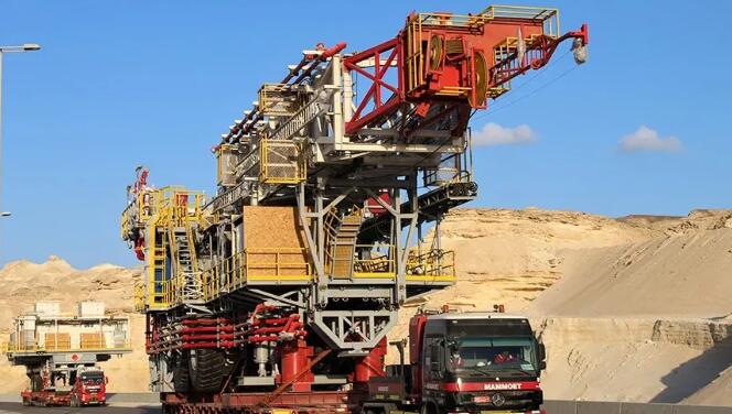 運輸前需要進行的準備工作包括對道路基礎設施進行改造,臨時替換100多個路燈和交通信號燈,建造臨時橋梁以保護地下電纜和管道。每個鉆機包括三個主要部分和三個較小的部分,重量從147噸到471噸不等。它們在杰貝阿里自由區(qū)的制造廠用大件運輸車運輸至杰貝阿里港,然后在港口裝載到Mammoet駁船上,再通過水路運輸到阿曼。最后在杜克姆港接收并裝載進行陸運,鉆機段被運送到Nimr現場400公里。