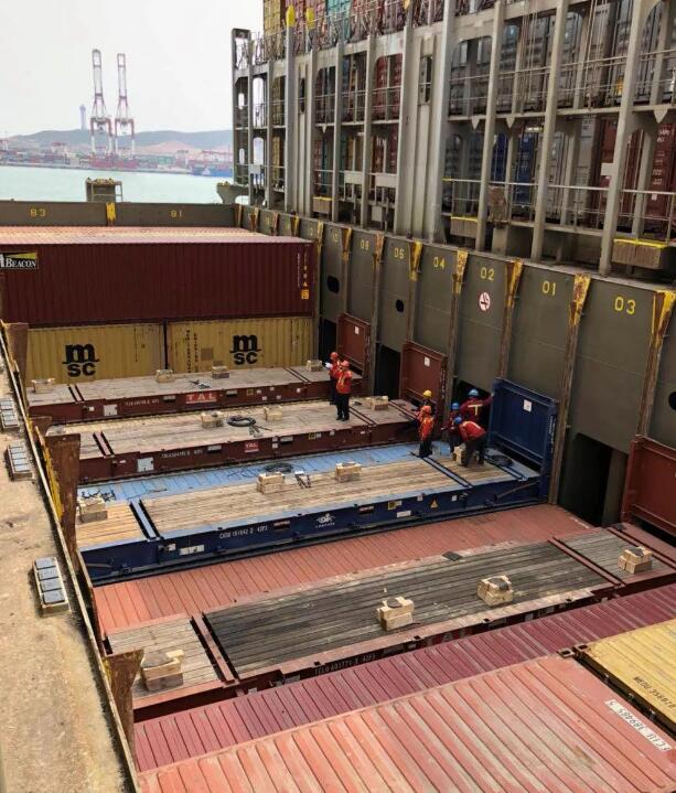 裝卸完成之后將四周圍的框架鎖住固定,就完成裝載了。這也是框架集裝箱最容易讓人識別出來的一個特性。