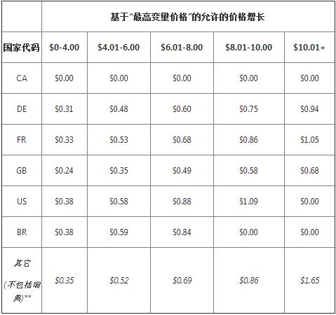 針對(duì)每個(gè)配送國(guó)家/地區(qū),允許的價(jià)格增長(zhǎng)如下列表格所示。