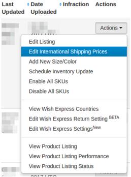 若要為促銷產(chǎn)品手動(dòng)編輯“國(guó)際運(yùn)費(fèi)”,請(qǐng)?jiān)诋a(chǎn)品頁(yè)面點(diǎn)擊“措施> 編輯國(guó)際運(yùn)費(fèi)”。