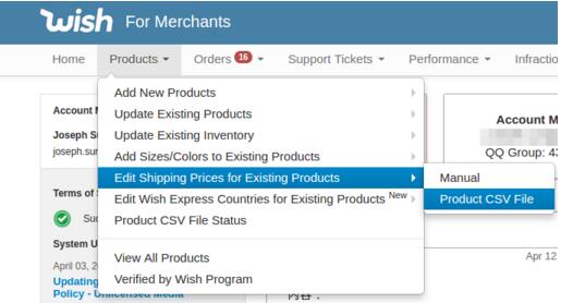 若要通過CSV更新促銷產(chǎn)品的“國(guó)際運(yùn)費(fèi)”,請(qǐng)打開”產(chǎn)品> 為現(xiàn)有產(chǎn)品編輯運(yùn)費(fèi)> CSV文件”。根據(jù)前文的指導(dǎo),您可以在此上傳“.csv文件”為您的促銷產(chǎn)品更新運(yùn)費(fèi)。
