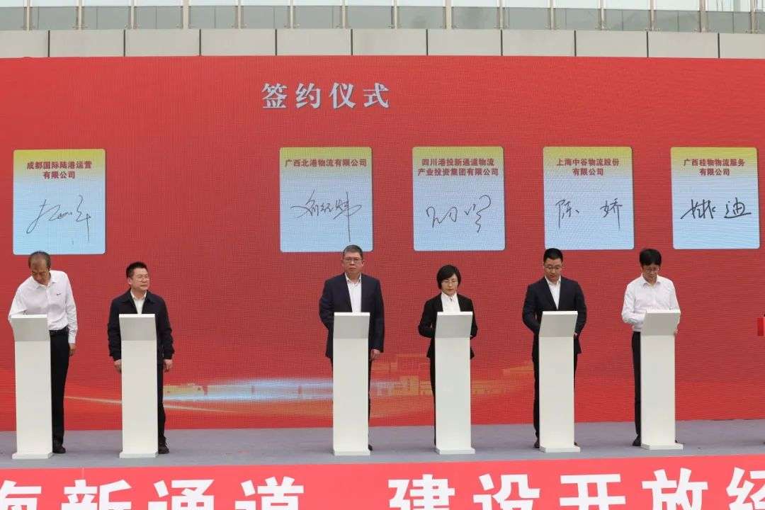 儀式上,四川港投集團(tuán)新通道物流公司和北部灣港集團(tuán)下屬公司北港物流和北部灣聯(lián)運(yùn)及各有關(guān)企業(yè)分別簽訂了冷鏈物貿(mào)、海鐵聯(lián)運(yùn)等方面合作協(xié)議及“園區(qū)+運(yùn)配貿(mào)產(chǎn)融”合作協(xié)議。
